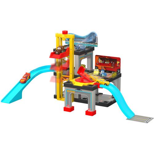手動エレベーターでの上下移動やターンテーブルからハンドシューターでカーズ トミカを発車できます。
